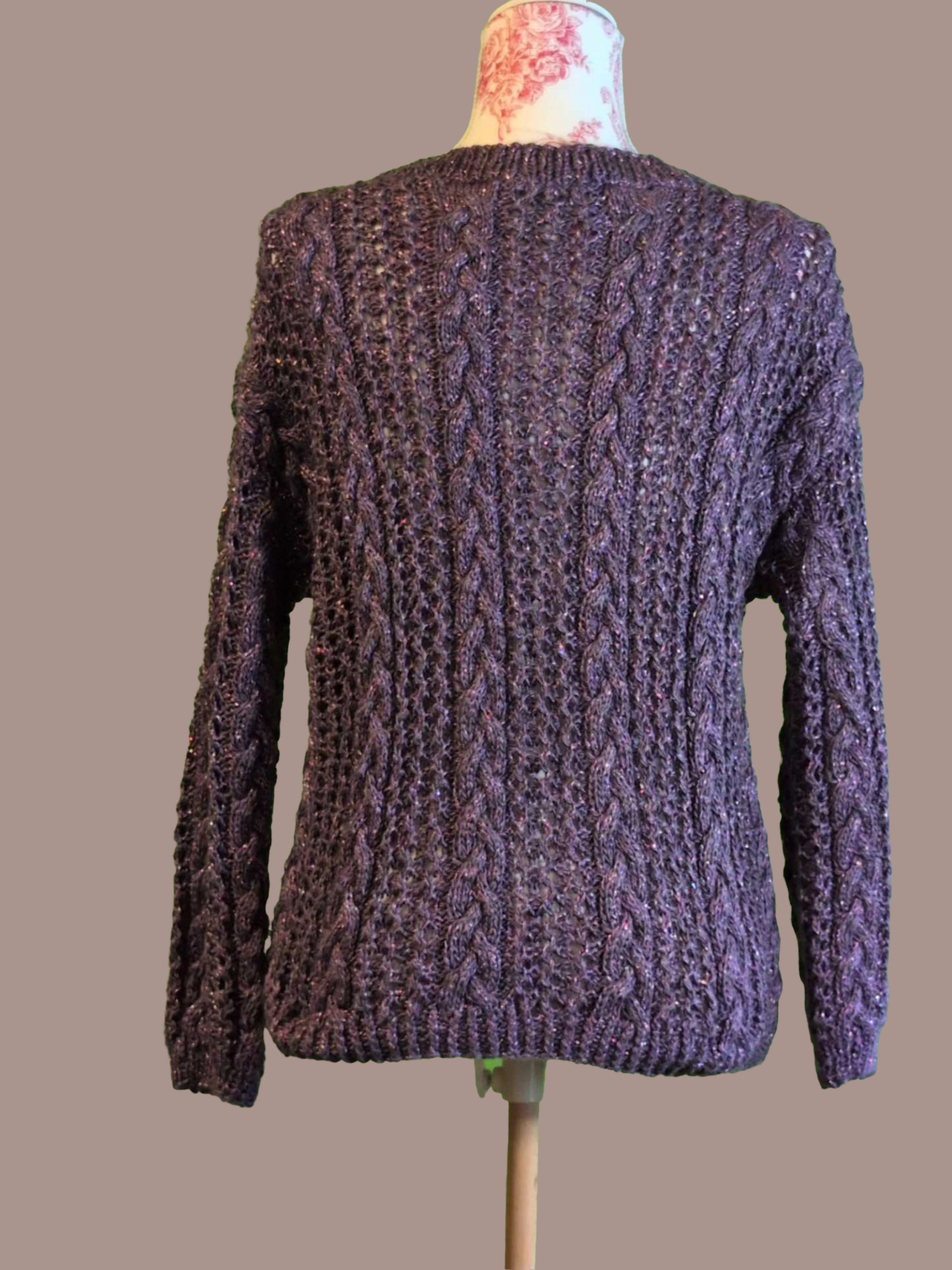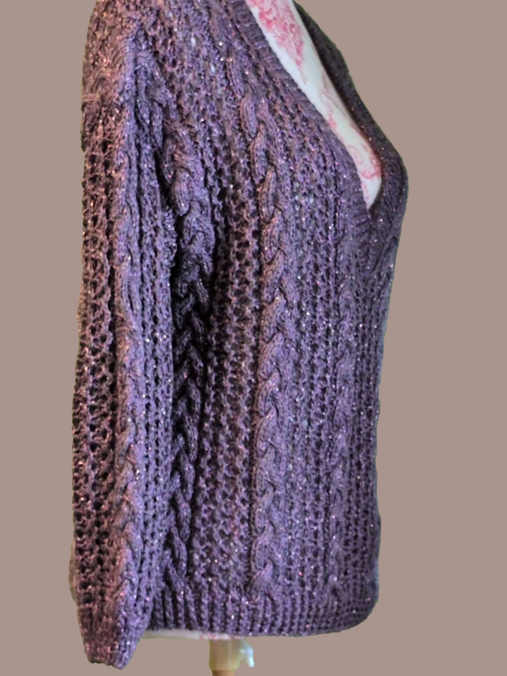 Handgestrickter Pullover im aufwendigen Zopfmuster aus der Sabrina. Verarbeitet wurden Lana Grossa Mulberry Lace (mit Seide) und Brillino (Glanzgarn). Mit tiefem V-Ausschnitt. Elegant & edel. Einzelstück.