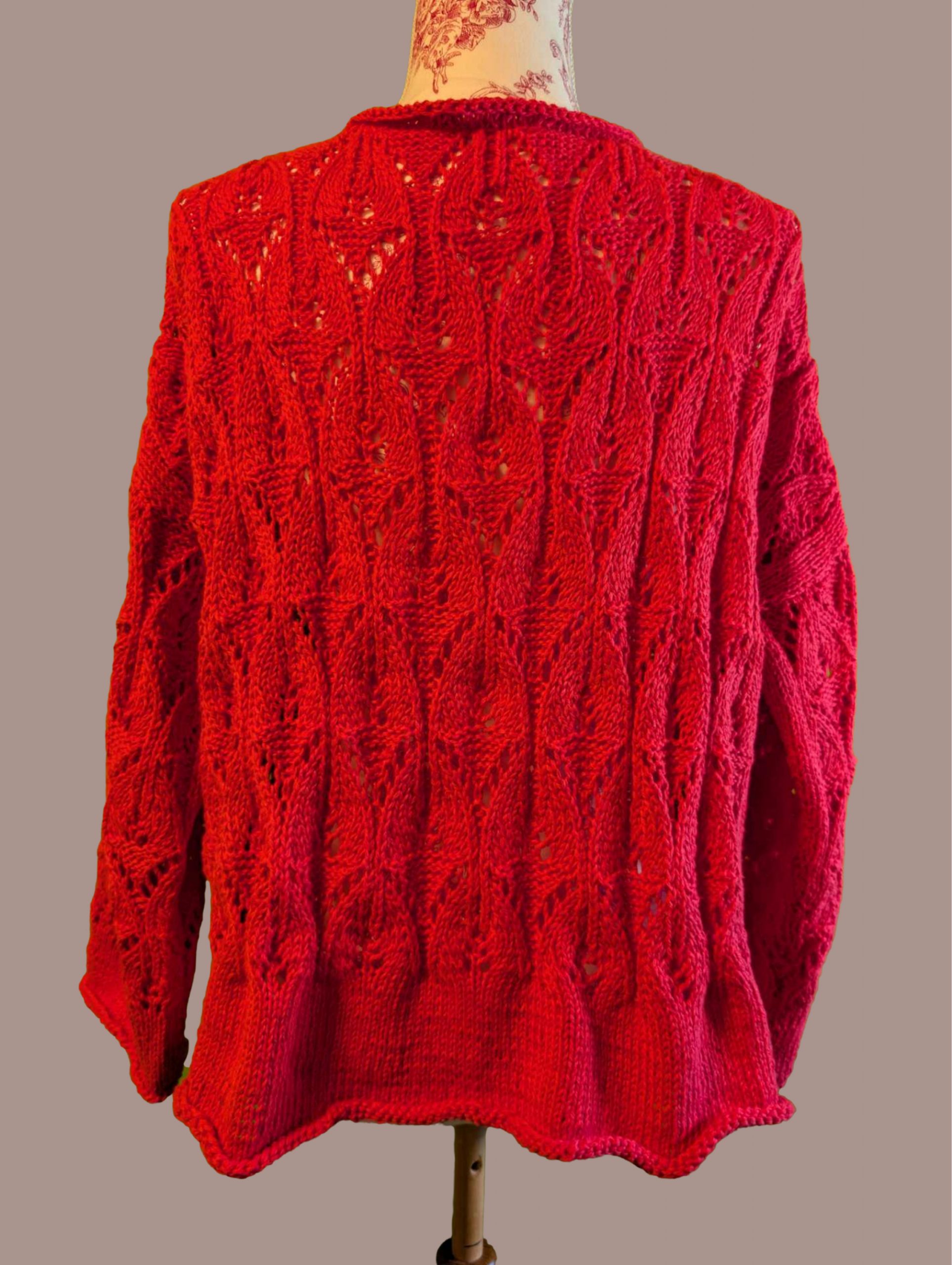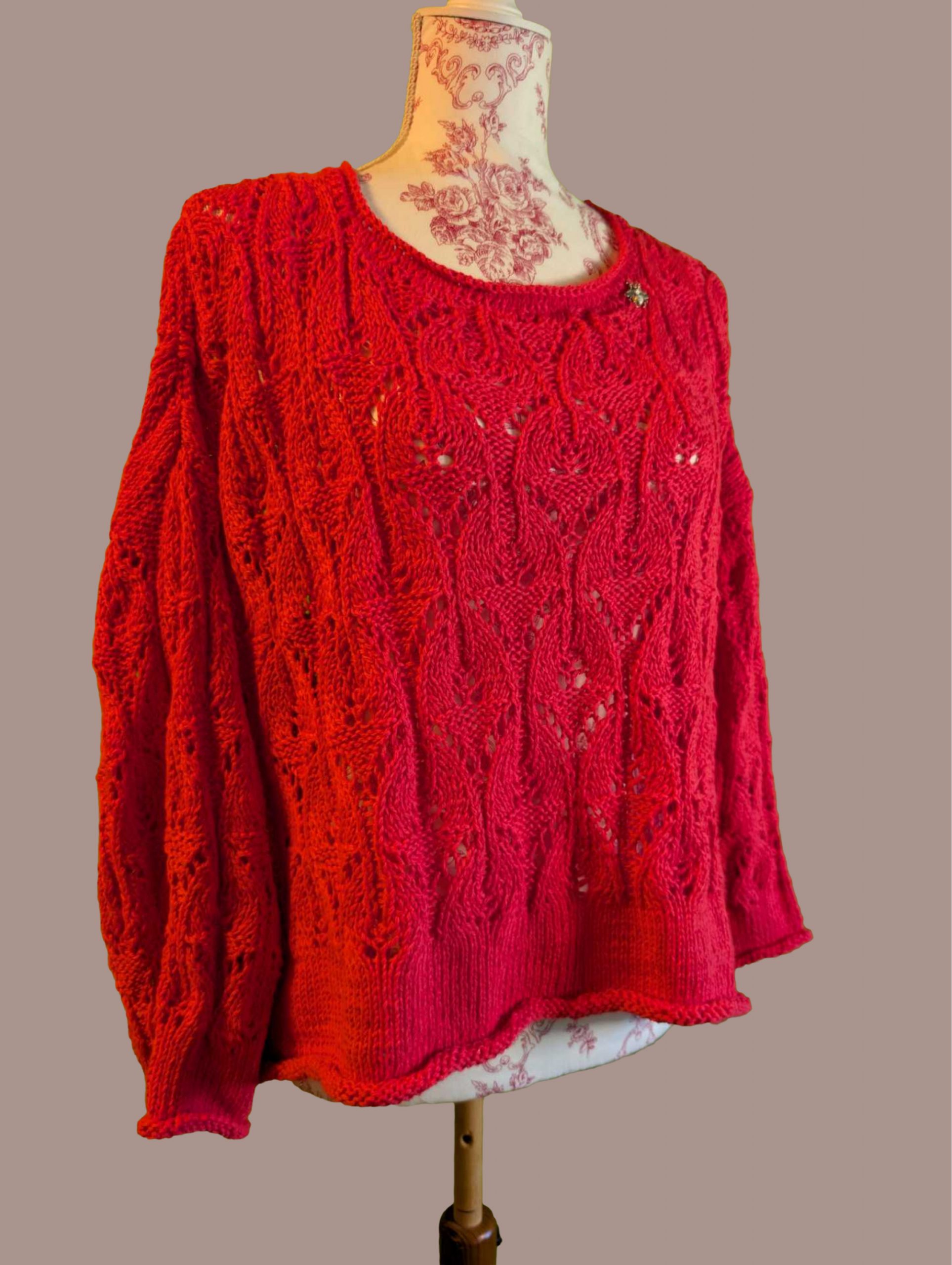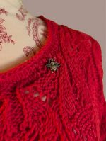 Handgestrickter, cropped Oversize-Pullover mit Ajourmuster aus Lana Grossa Dodici in intensivem Kirschrot. Modell aus Filati Classici, verziert mit einer kleinen Bienenbrosche. Größe 40 (oversize). Einzelstück.