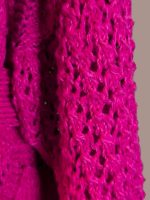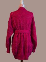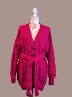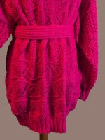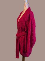 Handgestrickte Jacke im auffälligen Strukturmuster aus der Zeitschrift Sabrina. Zwei edle Garne kombiniert: 100 % Baumwolle & 100 % Kaschmir. Mit Gürtel, Taschen & Knöpfen. In leuchtendem Pink. Einzelstück.